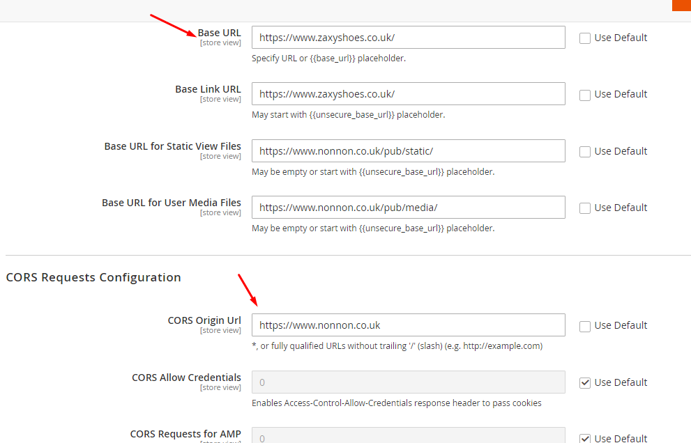 Also I have added CORS Origin URL in magento admin that is responsible for zaxyshoes.co.uk as nonnon.co.uk that is responsible for serving static content.