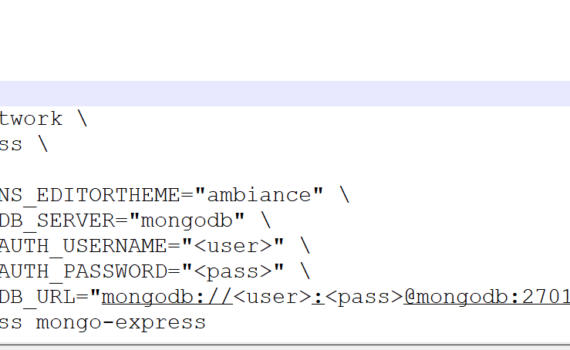 This one’s weird: (notepad++): ### Init mongo-express docker run -d --network mongo-network --name mongo-express -p 8081:8081 -e ME_CONFIG_OPTIONS_EDITORTHEME="ambiance" -e ME_CONFIG_MONGODB_SERVER="mongodb" -e ME_CONFIG_BASICAUTH_USERNAME="<user>" -e ME_CONFIG_BASICAUTH_PASSWORD="<pass>" -e ME_CONFIG_MONGODB_URL="mongodb://<user>:<pass>@mongodb:27017/" --name mongo-express mongo-express adding image for clarity: Copying the above into a cygwin terminal produces: docker run -d > --network mongo-network > --name mongo-express […]