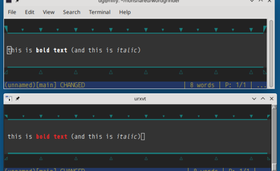 On rxvt, and only on rxvt, then when I display text using the ncurses A_BOLD attribute then it’s artificially coloured. Top is gnome-terminal, bottom is rxvt-unicode. Does anyone know enough about the rxvt configuration to know whether I can stop this happening? It does seem to be correctly finding the […]
