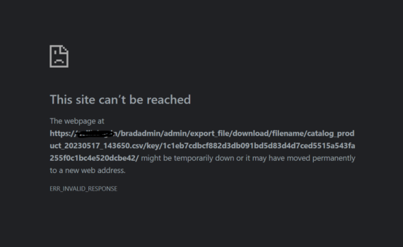 While downloading product.csv file in MAGENTO getting below error: ========= The webpage at https://example.in/bradadmin/admin/export_file/download/filename/catalog_product_20230517_143650.csv/key/1c1eb7cdbcf882d3db091bd5d83d4d7ced5515a543fa255f0c1bc4e520dcbe42/ might be temporarily down or it may have moved permanently to a new web address. ERR_INVALID_RESPONSE ============ Hosting is in AWS. Please HELP!!!