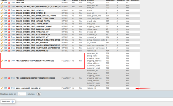 I want to add an index to an existing index using Setup/UpgradeSchema: $connection = $setup->getConnection(); $tableName = $setup->getTable('sales_order_grid'); $indexName = 'sales_ordergrid_netsuite_id'; $columnName = 'netsuite_id'; $connection->addIndex( $tableName, $indexName, $columnName, MagentoFrameworkDBAdapterAdapterInterface::INDEX_TYPE_FULLTEXT ); It’s creating new insted of adding to existing index. How can I add an index in existing(“FTI_65B9E9925EC58F0C7C2E2F6379C233E7”) index? Thank.