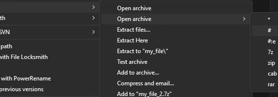 I have a 7zip file that I could not open. When I right clicked on it, I saw an open archive submenu. When I clicked on the ‘#’ option, I was able to open the archive. I can’t seem to find any documentation on what this ‘#’ means in this […]
