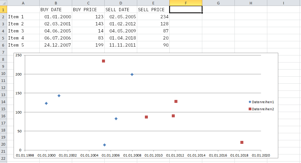 The visualisation that I have in mind shows these five pairs of transactions with a “date” axis (x) and a “price” axis (y), and, most importantly, to illustrate the development of the prices, a line that, for each item, connects the “buy” and the “sell” dots.