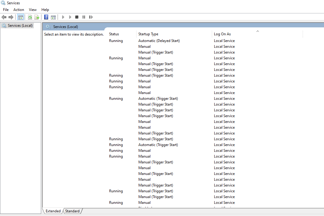 As shown below, the extended tab of the Services console (services.msc) all of a sudden stopped showing service Name and Description columns. I tried right clicking on other column’s headers to see if there is an option to make the other columns visible but right click does not show any menu. Some online search suggests running regsvr32.exe jscript.dll and regsvr32.exe mmcndmgr.dll command as an administrator and re-open the console – but it did not work.
