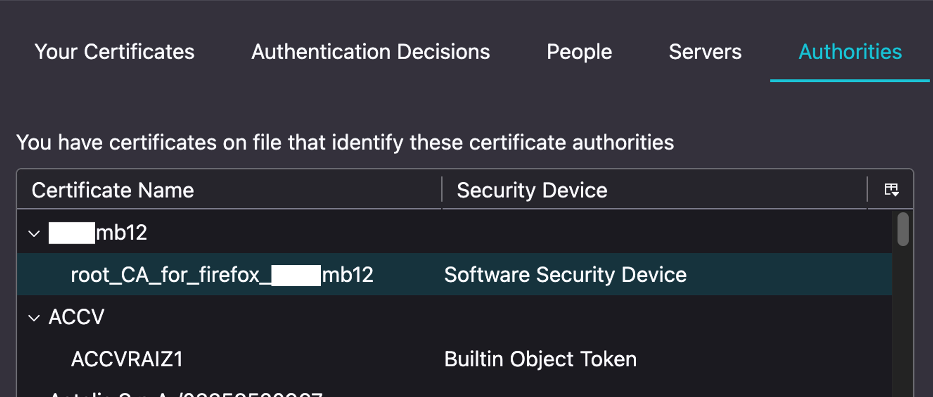 Here is the Firefox Authorities screenhot, which is the same on Linux and MacOs: