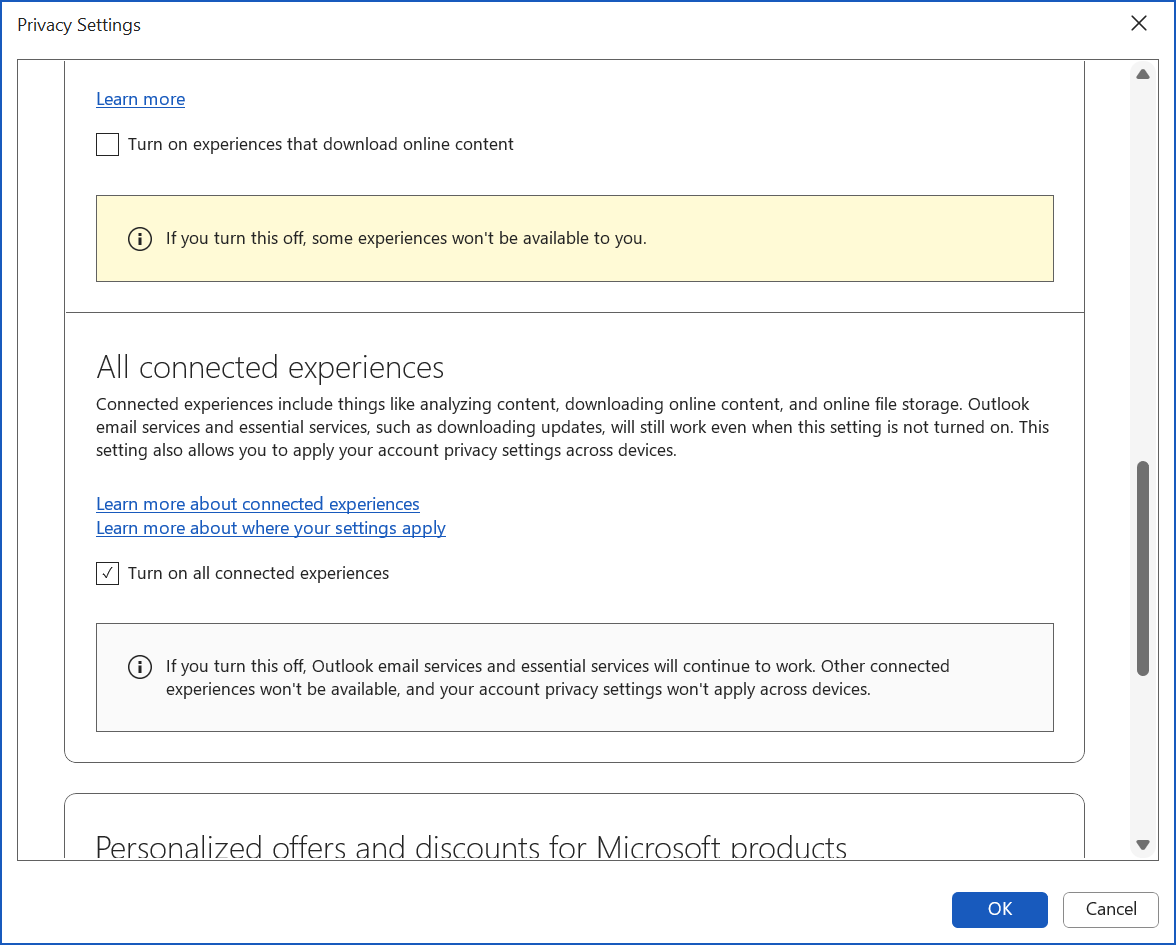 I have read that I can open a word doc, click on “file/account/(account privacy)manage settings”, scroll down to “All connected experiences”, enable those, and then restart. I did that, and restarted the entire machine. But help continues to give the same message.