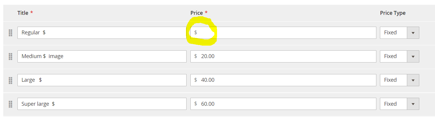 The problem appears when there is nothing at all listed in the Price field of the Regular size: