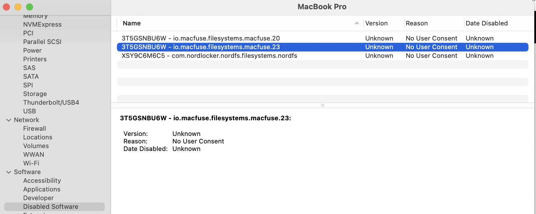 When I look into Disabled Software in my OSX, I see that the macFuse app (that’s what I installed) is flagged as disabled software.