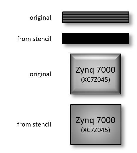 Both shapes are just rectangles with formatting (background gradients and/or beveling) – nothing else. The shapes labeled “original” are what I drew. I then dragged those onto a stencil, and dragged them back onto the sheet.