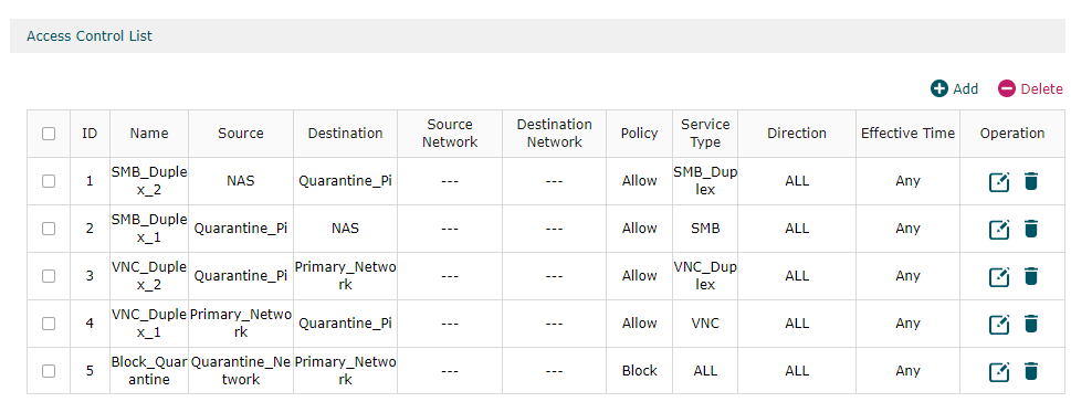 ACL rule 5 blocks communication from the quarantine network to my primary network. In order to get VNC to my quarantine pi from my primary network I initially added rule 4, which was insufficient (online reading suggested I needed an ACL for return messages), so I added a version of rule 3 that referenced the VNC service, and that still failed. On a whim I tried creating the VNC_duplex service definition which swaps source and destiation port and changing rule #3 from VNC service to VNC duplex, and viola VNC worked!